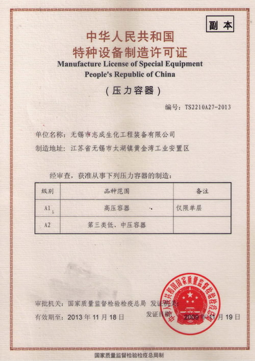 2009年11月,公司取得A1A2壓力容器制造許可證書